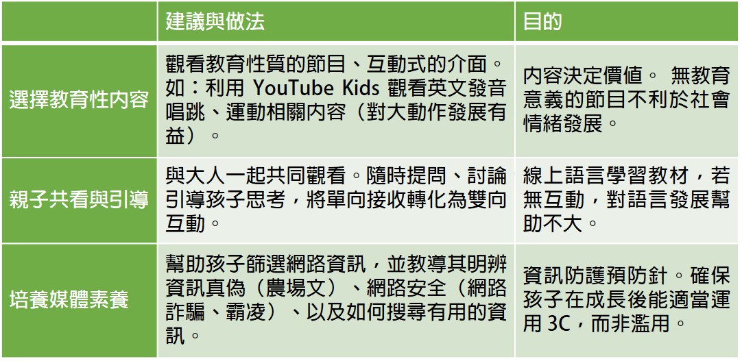請各位爸媽和小兒科醫師一起努力,幫孩子把關螢幕使用時間,選擇高品質的數位內容,並從小培養孩子的媒體素養,讓我們的下一代能駕馭數位工具,而不是被其控制。